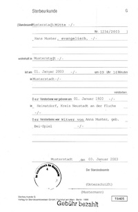 Die Sterbeurkunde erhalten Sie bei dem Standesamt, das den Sterbefall beurkundet hat. Urkundenarten Die Sterbeurkunde bescheinigt den Tod eines Menschen sowie den Ort und Zeitpunkt des Todes. Der Sterbeeintrag für das Stammbuch wird passend für Ihr Familienstammbuch erstellt.